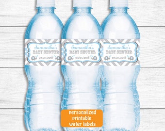 Boy Elephant Water Bottle Wrappers, Labels for a Elephant Baby Shower ... ⓟPERSONALIZATION: These Boy Elephant Water Bottle Wrappers can be personalized with NAME, date and you can have a custom text on the sides for an extra charge - please contact us prior to the order for a quote/price. Water Bottle Labels, ideally, are designed to be printed on a waterproof sticker paper, yet you can use a regular sticker paper.